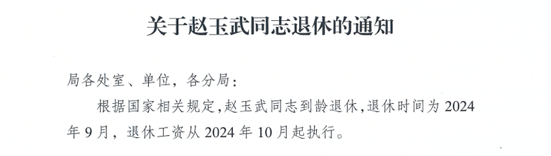 关于赵玉武同志退休的通知